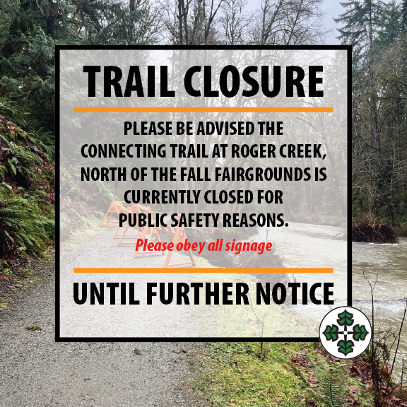 Please be advised the connecting trail (Scott Kenny Trail) at Roger Creek, north of the Fall Fairgrounds, is currently closed until further notice for public safety reasons.
