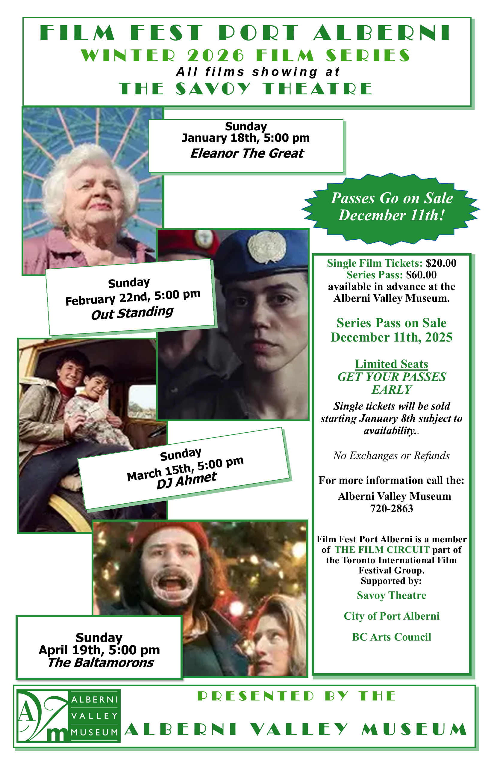 Film Fest Port Alberni film series screens at the Savoy Theatre on select Sundays at 5:00pm.