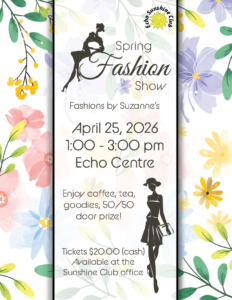 The Echo Sunshine Club is a volunteer driven, membership based organization, whose purpose is to provide opportunities and activities to improve and enhance the quality of life for adults and seniors aged 50 years or better. The Sunshine Club aims to offer a wide variety of programs that interests our members and it is always growing and evolving so if you don’t see what you are looking for, let us know and we can look into creating a new program.