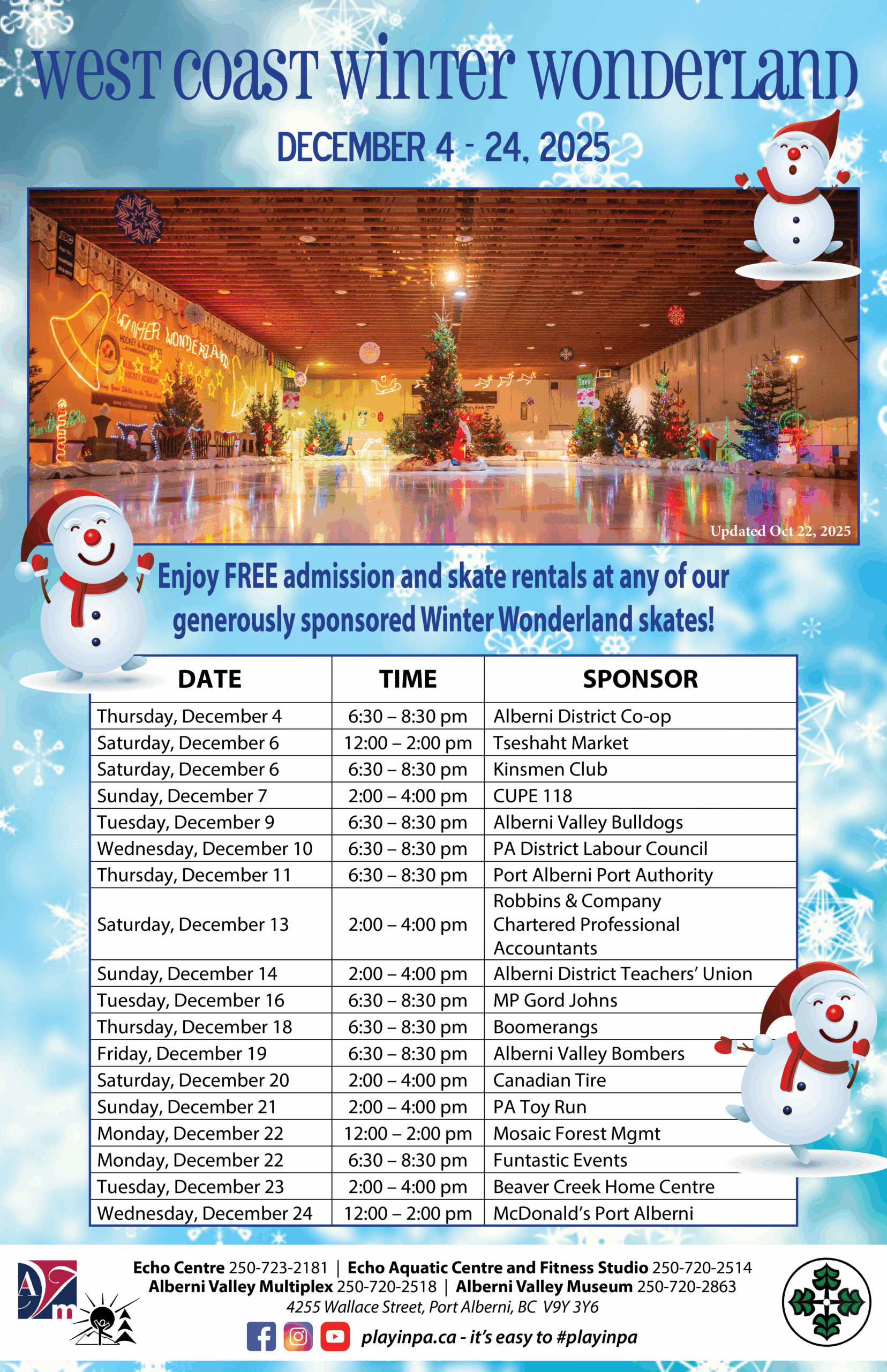 You can find our Winter Wonderland public drop-in dates and times on our Special Events page at playinpa.ca/special-events/ or our Public Drop-In page at playinpa.ca/schedules/